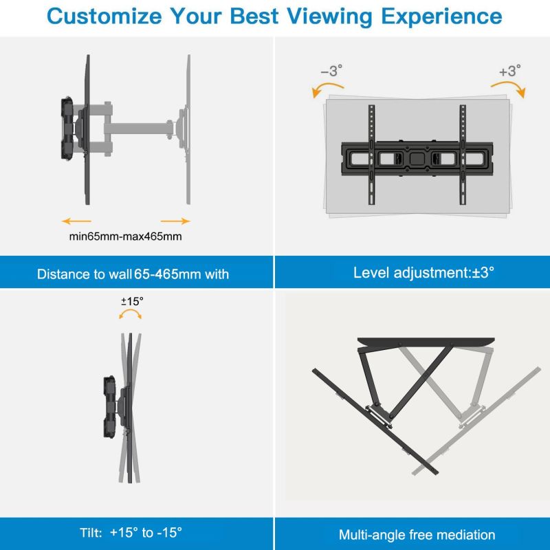 Durch einen flexiblen Blickwinkel, der Neigung von -15° bis +15° ermöglicht, einen beeindruckenden Schwenkbereich von +/- 90° und einen Schwenkarm, der den Fernseher bis zu 6.5cm platzsparend gegen die Wand klappen oder beeindruckende 46,5cm aus der Wand herausziehen kann, werden optimale Sichtverhältnisse geschaffen. Bei Bedarf kann der Fernseher sogar um 180º gedreht werden, um den Blickwinkel zu maximieren.