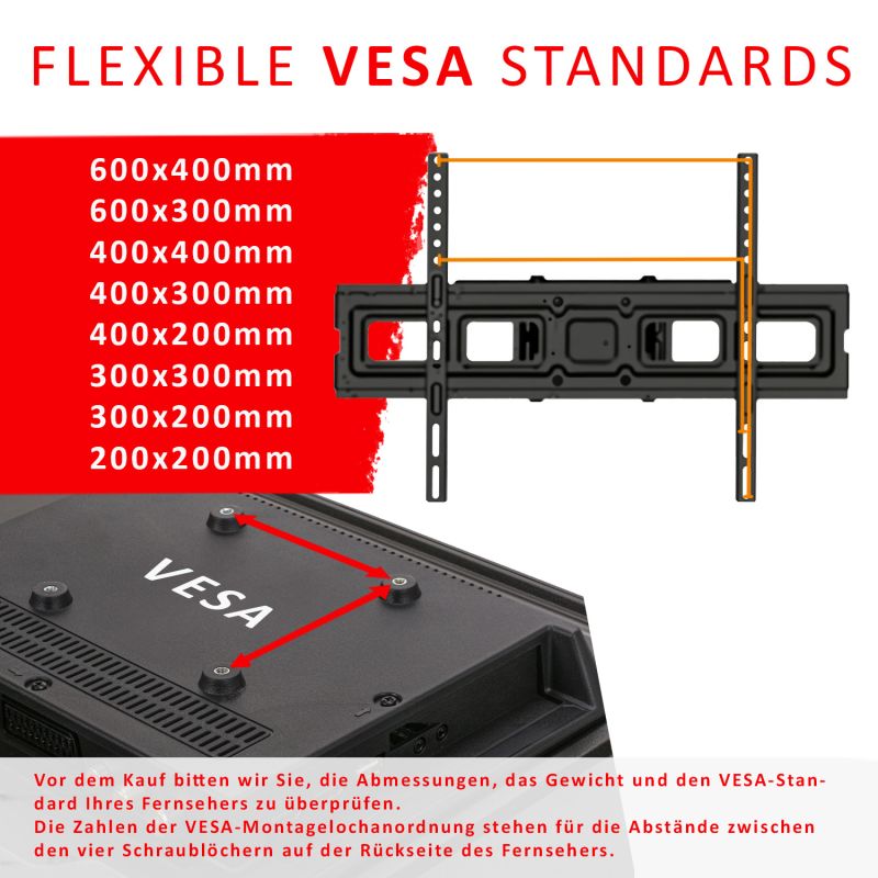 ✅ FLEXIBLE VESA-STANDARDS: Unsere VESA Halterungen (Lochmuster für die TV-Montage) sind flexibel anpassbar und die VESA Adapter sind passend für folgende Größen: 200x200mm, 300x200mm, 300x300mm, 400x200mm, 400x300mm, 400x400mm, 600x300mm und 600x400mm. Vor dem Kauf bitten wir Sie, die Abmessungen, das Gewicht und den VESA-Standard Ihres Fernsehers zu überprüfen. Die Zahlen der VESA-Montagelochanordnung stehen für die Abstände zwischen den vier Schraublöchern auf der Rückseite des Fernsehers.